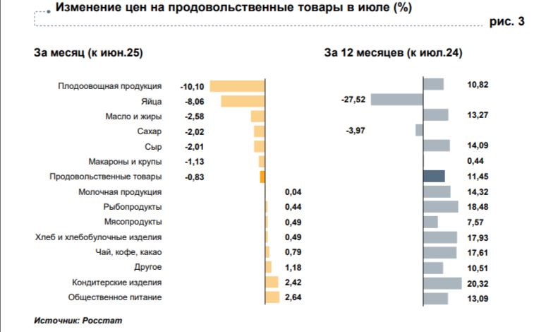 Так же как и в прошлые пять месяцев, в июле продолжали дешеветь яйца. За год цена на них снизилась на 27,52%. Причина – увеличение объемов производства в стране. Из-за роста предложения на оптовом рынке также стал дешевле сахар. За год цена снизилась на 3,97%. Из продуктов цены росли на кондитерские изделия, чай, кофе, какао.