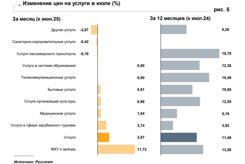 В июле цены на услуги в системе образования и телекоммуникационные услуги не изменились. Однако накопленным итогом с августа 2024 года они выросли на 12,38% и 15,49% соответственно.