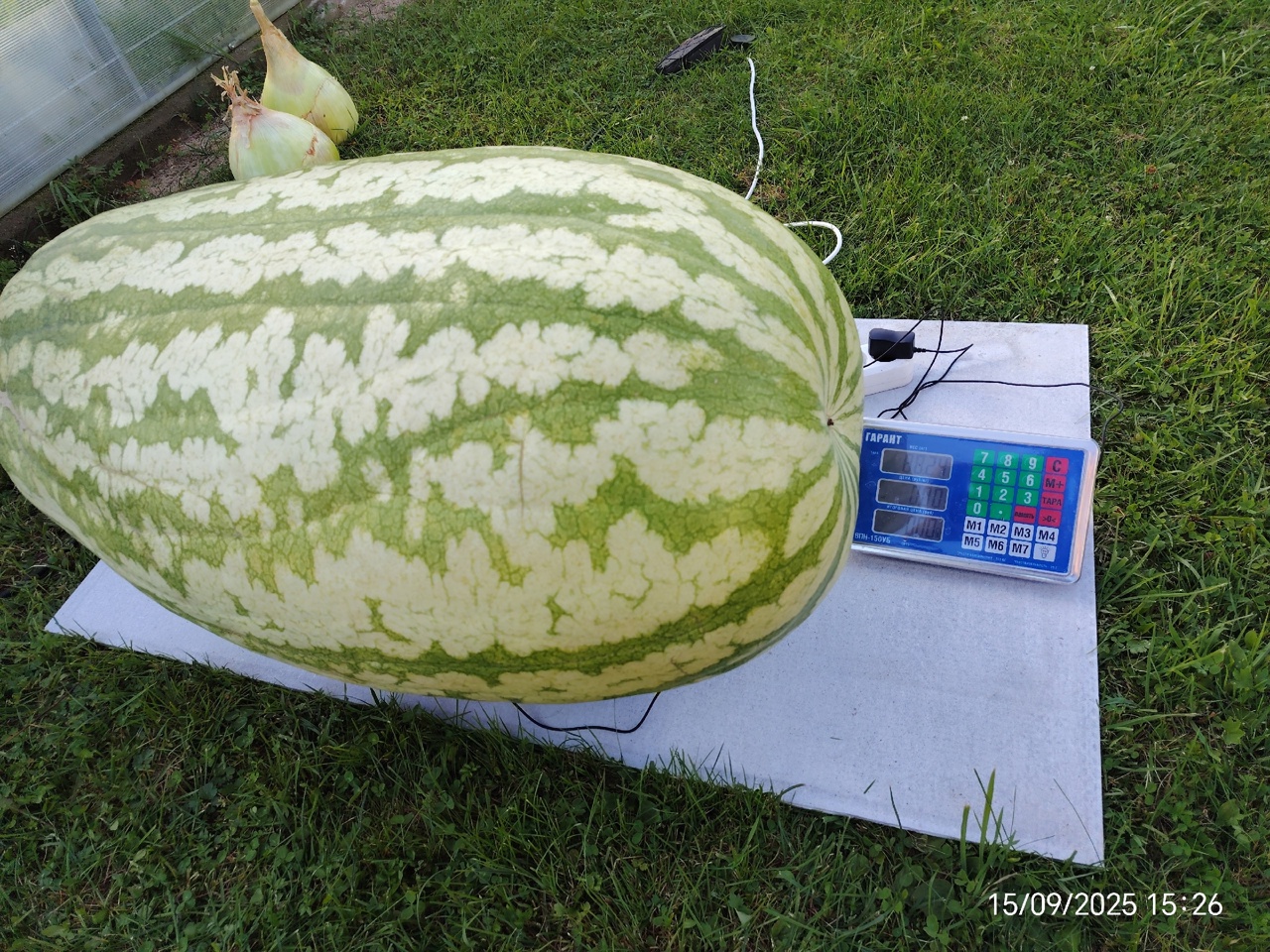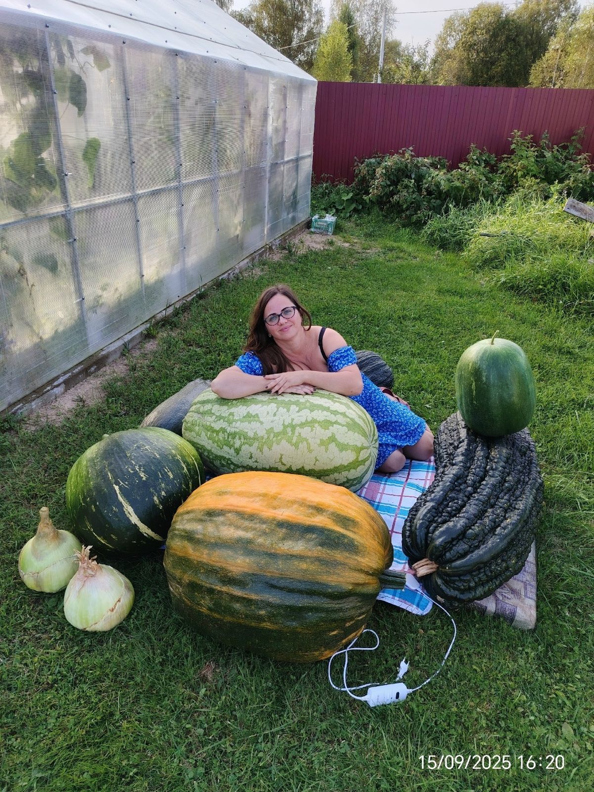 «Вот и срезала я свой арбузик по имени Галактика Андромеды. Опылен 27.06. Срезан 15.09 в возрасте 79 дней. Вес по замерам 86 кг. Если бы арбузик был высажен и опылен раньше, на весах была бы совершенно другая цифра», – рассказывает Ольга.