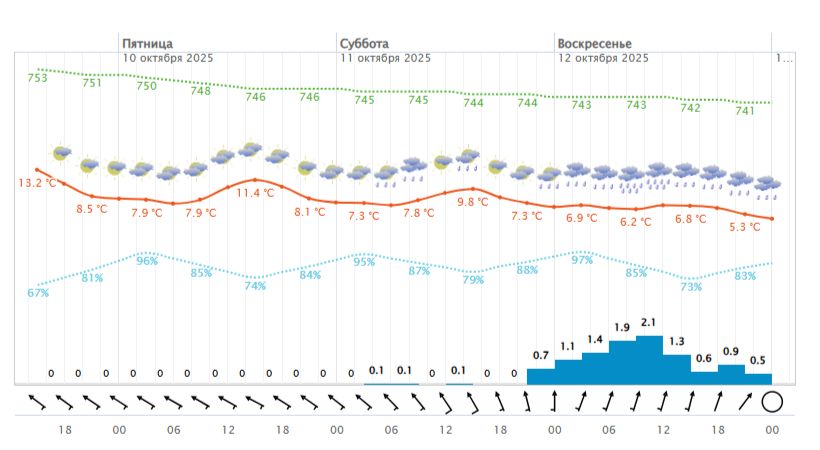 В Ярославле слабые дожди начнутся в субботу, 11 октября, а воздух прогреется лишь до 11 градусов. Со следующего дня ливни станут усиливаться и начнет понижаться температура, столбики покажут всего +7 градусов. На пик уровень осадков выйдет к полудню. В начале новой недели днем уже до шести градусов тепла, и к осадкам начнет примешиваться снег.