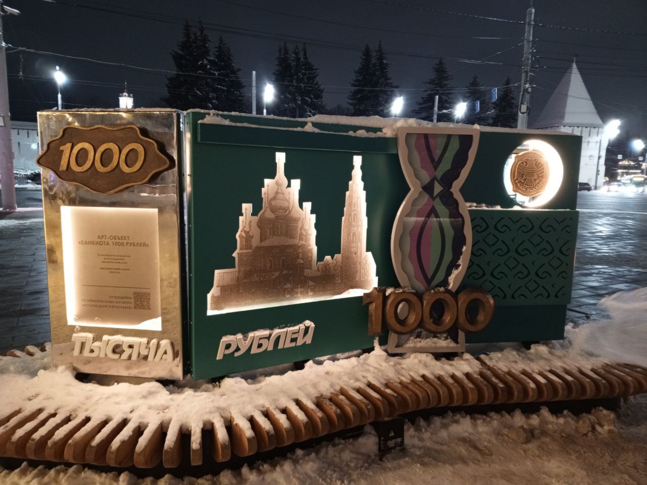 Скамья со стилизованной спинкой в виде 1000-ой банкноты была установлена в августе этого года. Она сразу заинтересовала горожан и туристов, поскольку связана с примечательным для Ярославля фактом – на российской купюре, как и на арт-объекте изображены архитектурные символы Ярославля. В городе даже возникла примета: сядешь на скамью, возьмешь в руки тысячу и так сфотографируешься – будет тебе счастье в финансовых делах. Теперь и в темное время суток городской арт-объект выполняет свои функции, как место отдыха и оригинальная фотозона.