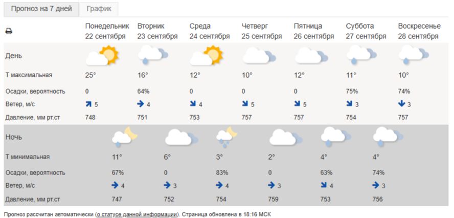 В четверг, 25 сентября, температура понизится до +10 градусов днем и до +2 – ночью. В пятницу и выходные температурный фон существенно не изменится, местами возможны небольшие осадки. В субботу синоптики прогнозируют осадки в видео мокрого снега на территории области.