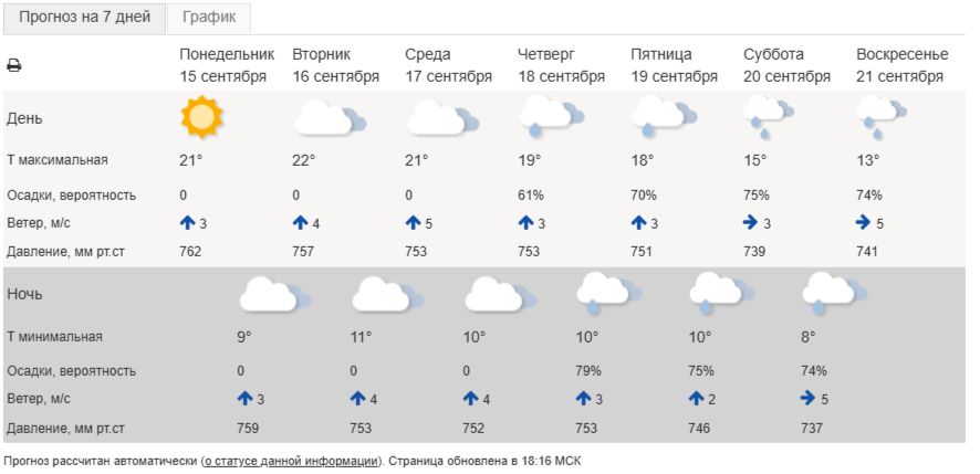 В середине недели облаков станет больше, и в четверг, 18 сентября, местами возможен небольшой дождь. Дневная температура опустится до +19 градусов. Также кратковременные осадки прогнозируются и в пятницу, 19 сентября. Температура днем – до +18 градусов.