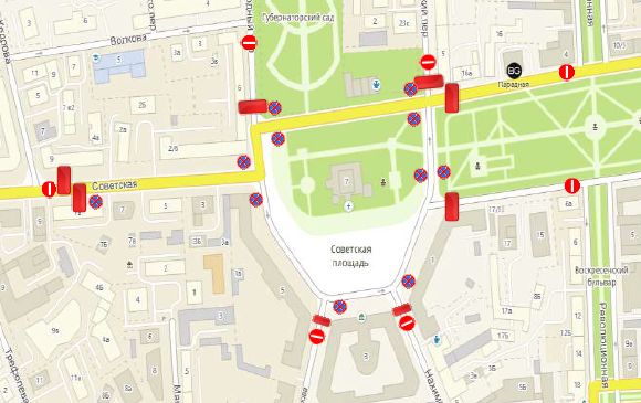 Как сообщили в мэрии Ярославля, ограничение движения будет действовать на участках улиц Советской, Нахимсона, Кирова, переулков Народного и Советского, а также площадей Советской и Челюскинцев. Также на участке улицы Советской и Советской площади с 19:00 25 августа до 17:00 26 августа будут ограничены остановка и стоянка транспорта.