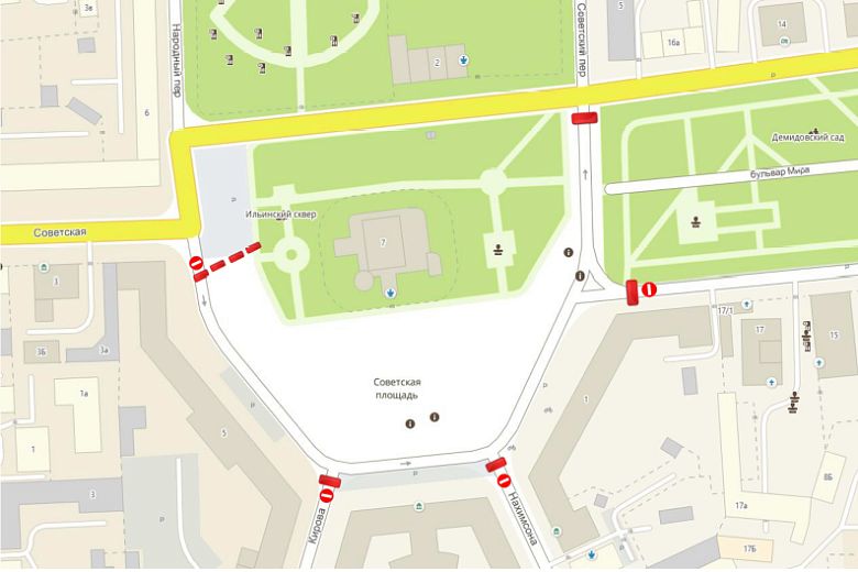 В центре Ярославля перекроют движение на время проведения эногастрономического фестиваля «Винные ярмарки России». Ограничение введут на Советской площади и участках улиц Кирова и Нахимсона, площади Челюскинцев. Знаки будут действовать с 20.00 27 апреля до 24.00 3 мая.