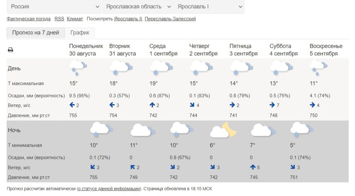 На этой неделе в Ярославскую область придет настоящая осень. Всю неделю в регионе, по данным Гидрометцентра, будут лить дожди, а самая высокая температура, +19 градусов, ожидается в среду, 1 сентября. Холодные дожди, вызванные прохождением арктического атмосферного фронта, будут сопровождаться промозглым северным ветром.
