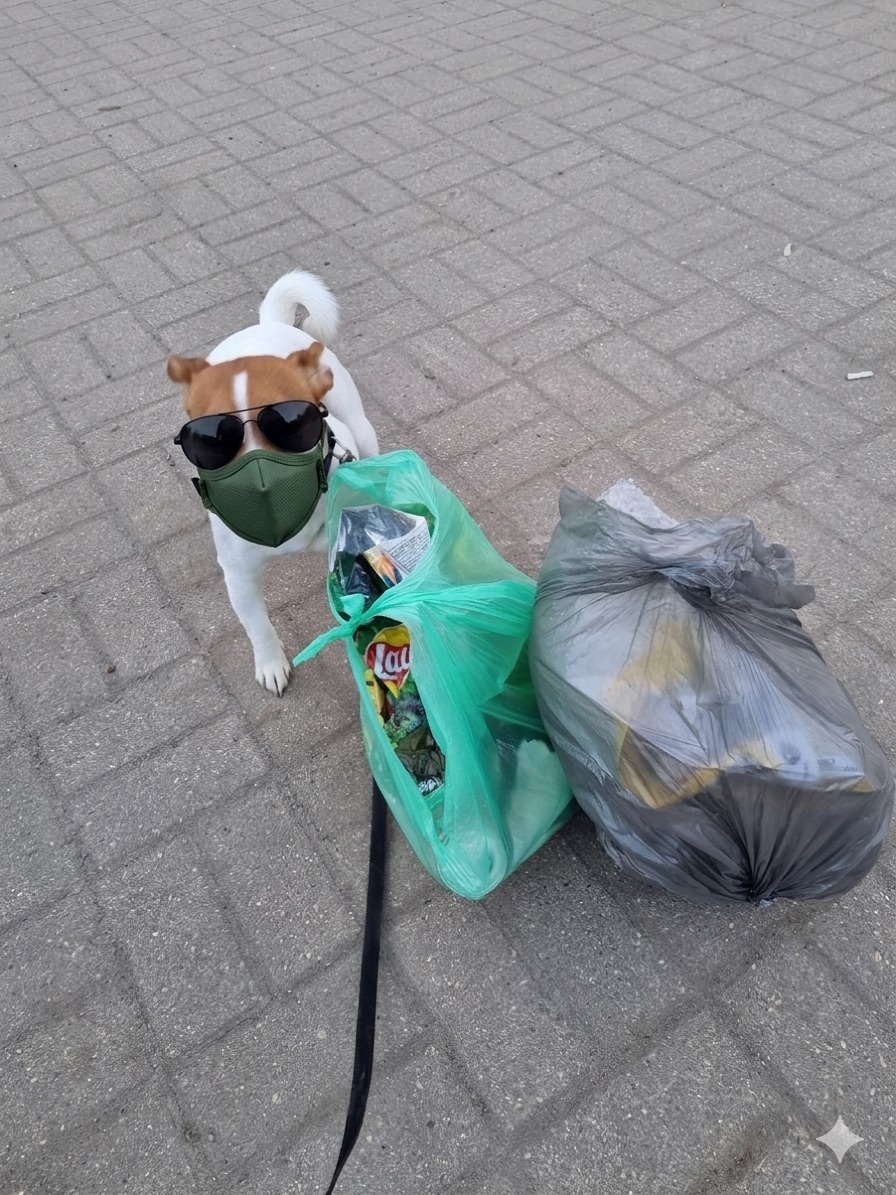 Собака породы джек-рассел вместе с хозяевами убирает мусор на Пятерке.