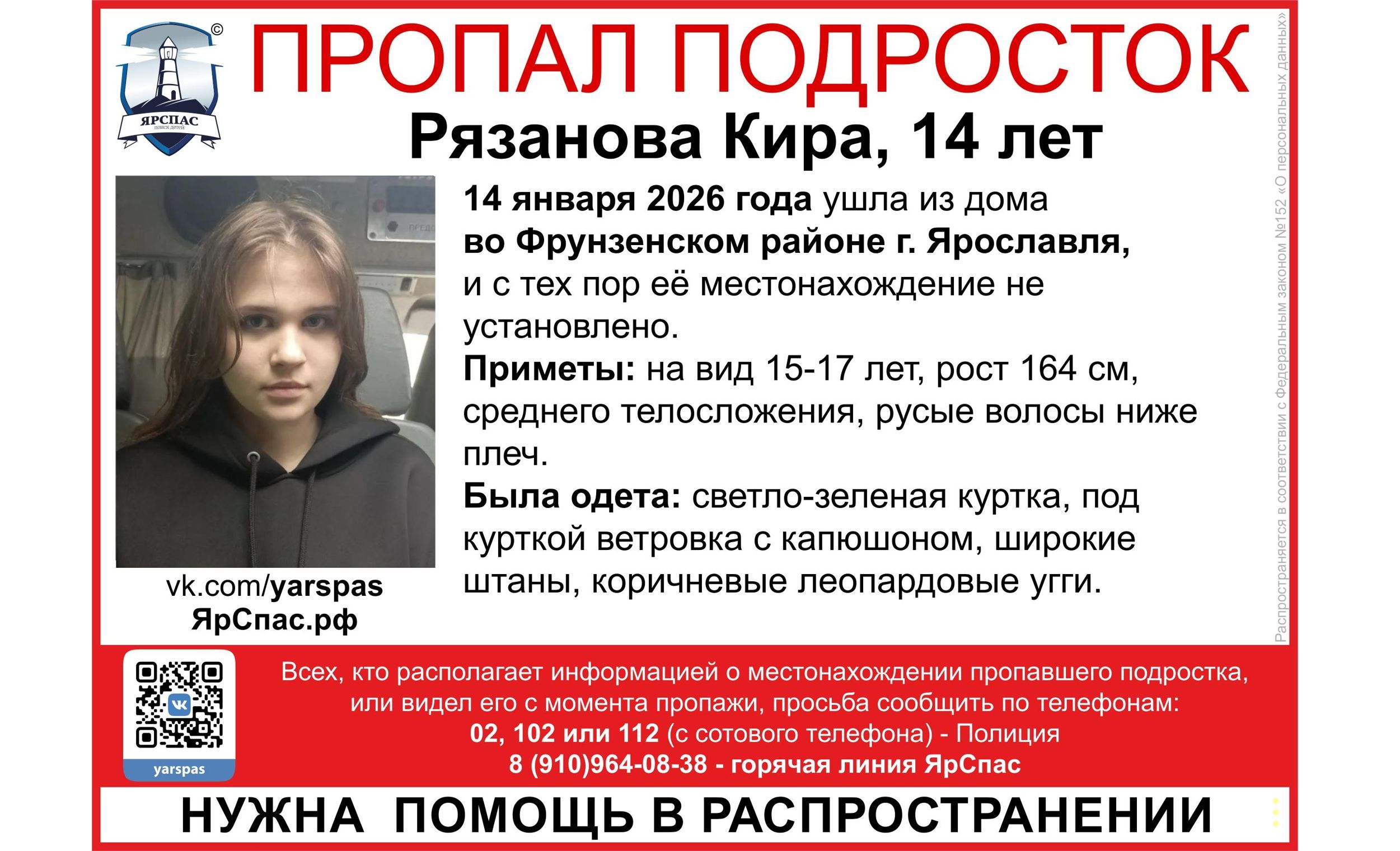 14 января из дома во Фрунзенском районе Ярославля ушла и не вернулась 14-летняя Кира Рязанцева. С тех пор ее местонахождение не установлено.