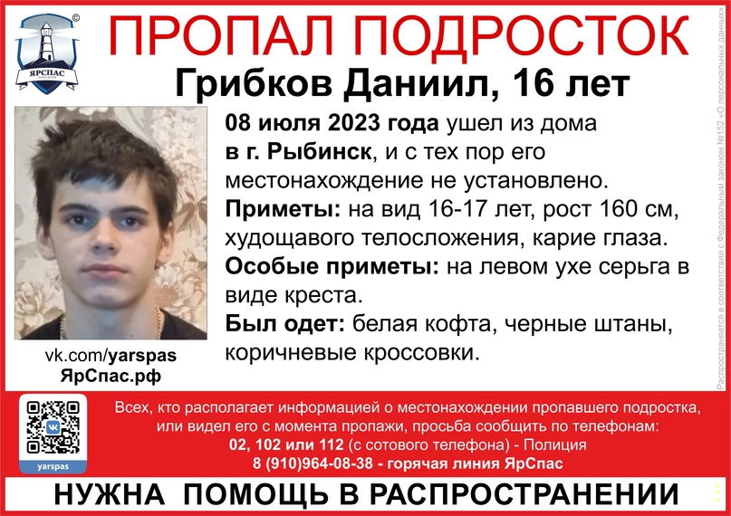 В Ярославской области идут поиски пропавшего подростка, который ушел из дома 8 июля. 16-летний Даниил Грибков проживает в Рыбинске. Сейчас его местонахождение не установлено.