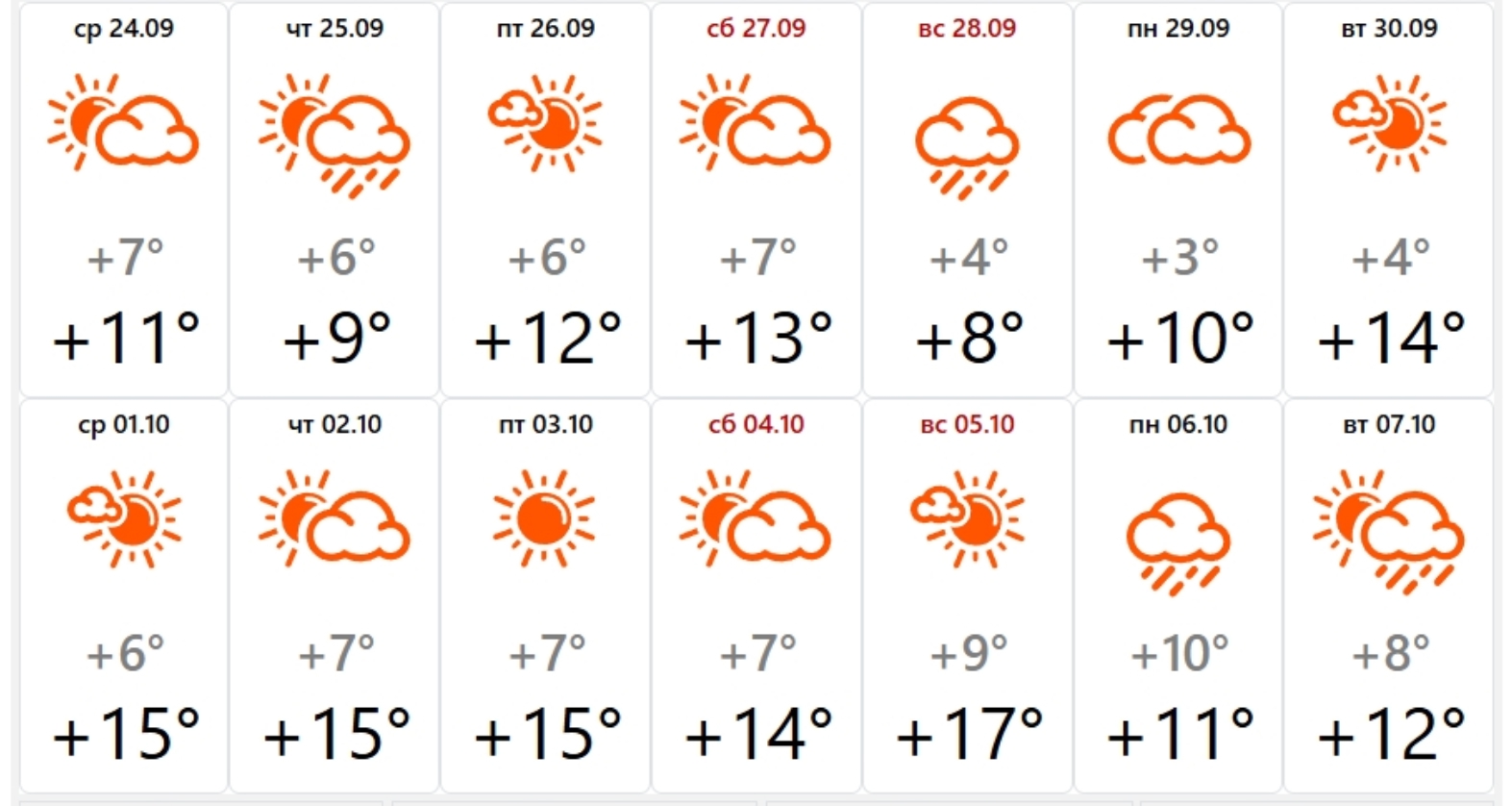 До 29 сентября ярославцев ждут дожди. Прогнозируется, что температура не поднимется выше отметки в +13 градусов. Во время «старого бабьего лета» до +15 – +17 градусов.