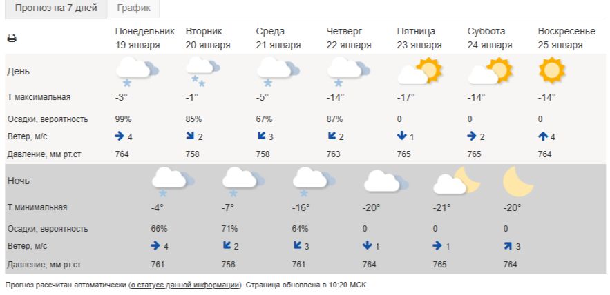 В понедельник, 19 января, температура воздуха составит днем -3 градуса. Вторник, 20 января, станет самым теплым днем на неделе – -1 градус днем. Затем ночью похолодает до -7 градусов. В среду, 21 января, похолодает до -5 градусов, а ночью столбики термометров опустятся уже до -16 градусов.