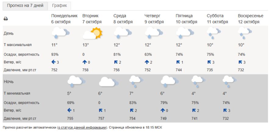 Во вторник, 7 октября, выглянет солнце и прогреет воздух до +13 градусов. Затем снова пойдут дожди, но их интенсивность ожидается небольшой. В остальные дни рабочей недели температура будет +11 – +12 градусов днем, а ночью опускаться до +6 – +7 градусов.