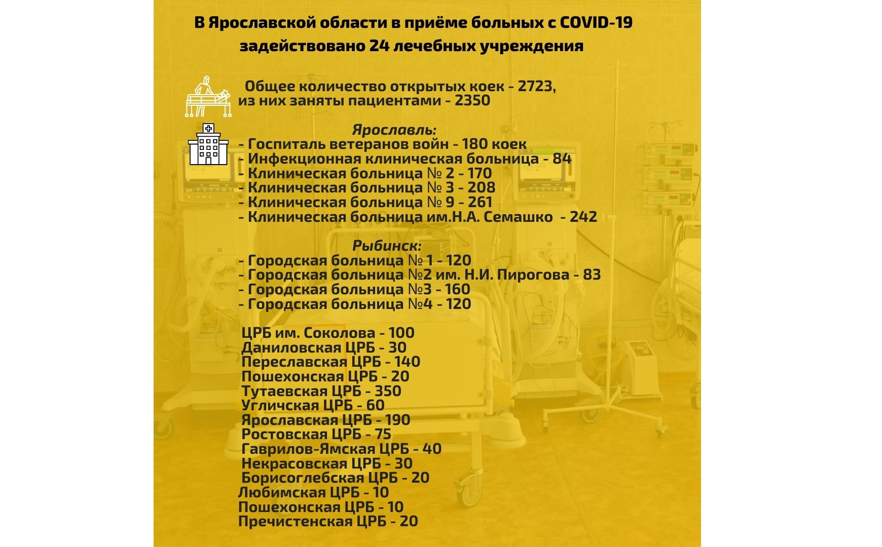 В Ярославской области за неделю развернули для пациентов с коронавирусом еще 160 коек. Сейчас в регионе 2323 койки для больных COVID-19. Из них занято 2350 коек.