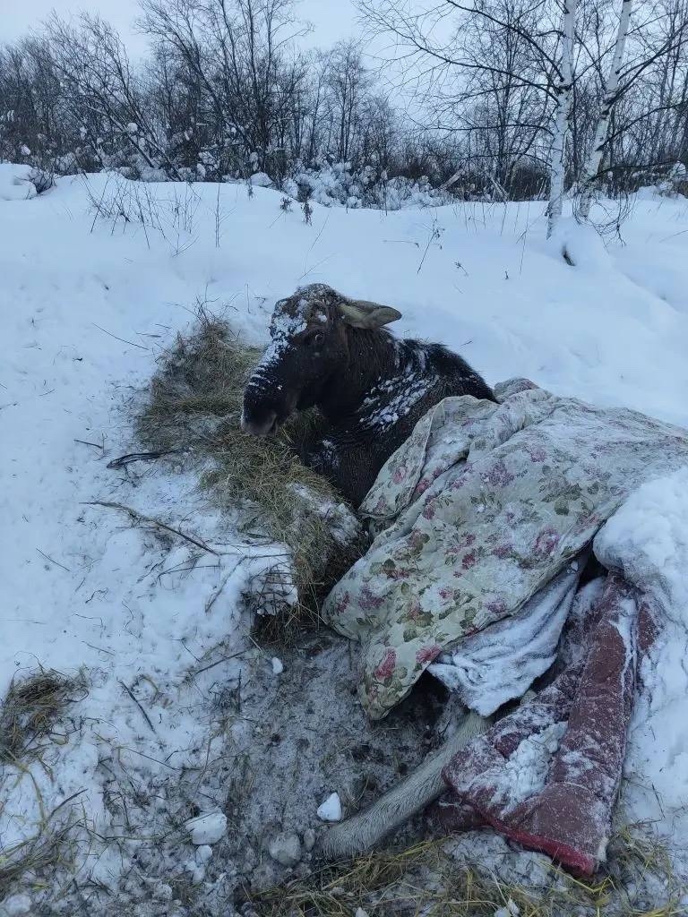 Неравнодушные жители уложили лося на сено, укрыли его одеялами и ждали помощи профильных служб. Все это время они приносили еду и питье. Во вторник, 27 января, утром ситуация сдвинулась с места.