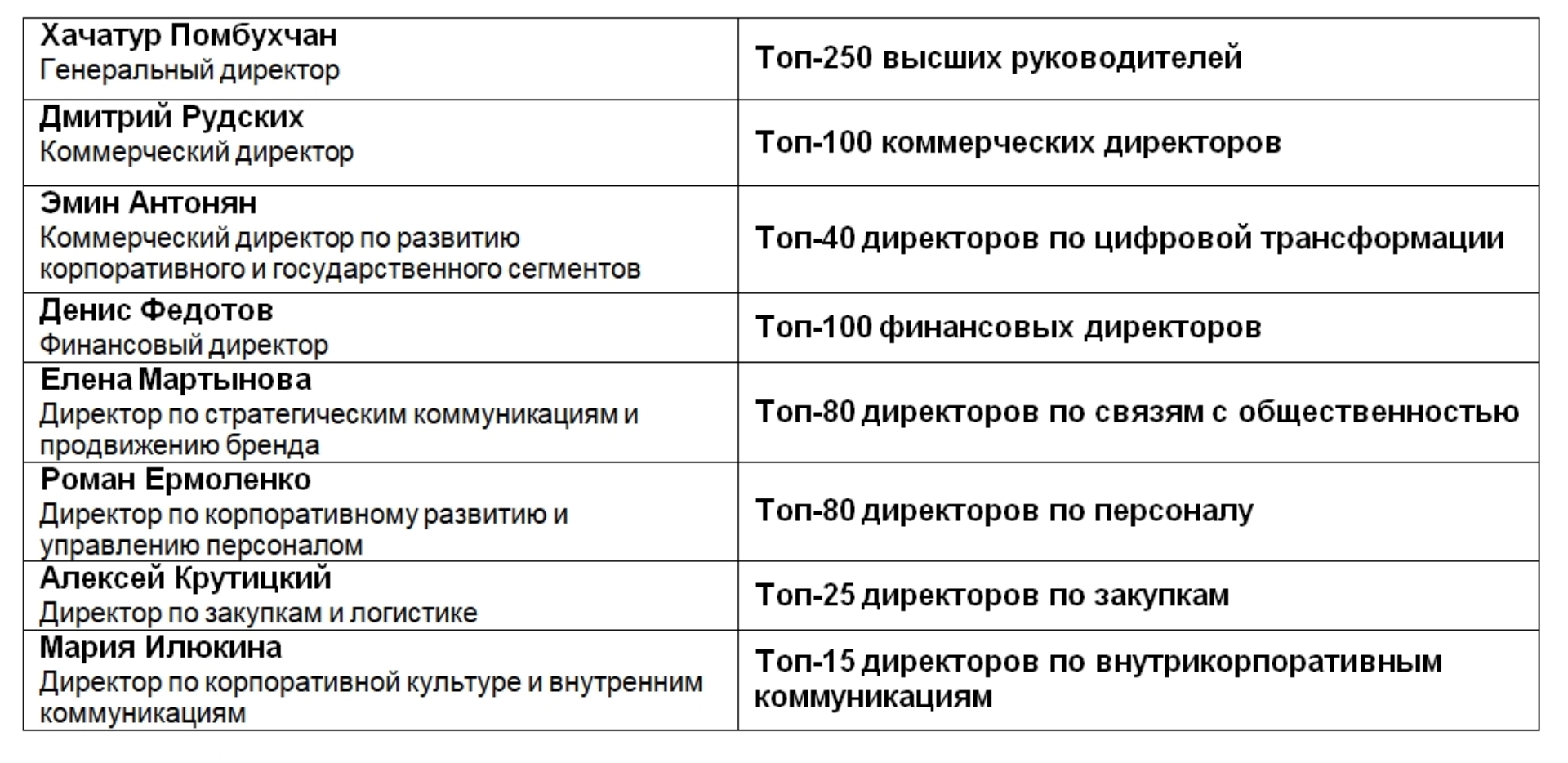 Также в тройку лучших вошли директор по связям с госорганами Владимир Месропян, директор по правовым вопросам Сергей Переверзев, директор по развитию корпоративного бизнеса Наталья Талдыкина, директор по бренду и маркетинговым коммуникациям Татьяна Гура, директор по складской и транспортной логистике Татьяна Гусева, директор ИТ-инфраструктуры Павел Табашников, руководитель проектов по социальным программам Оксана Туранцева и корпоративный секретарь Дарья Лизунова.