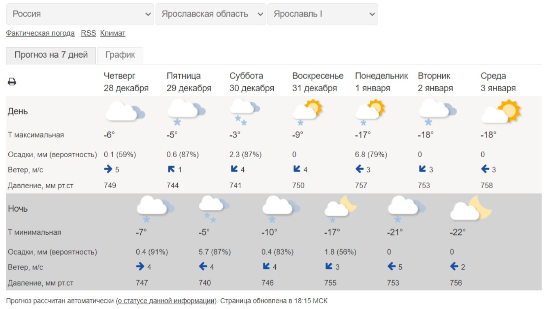 В ночь с 31 декабря на 1 января прогнозируют до -17 градусов. Днем 31 декабря – -9 градусов, а днем 1 января – -17 градусов. Пройдет небольшой снег. Термометры пересекут отметку в -20 в ночь с 1 на 2 января.