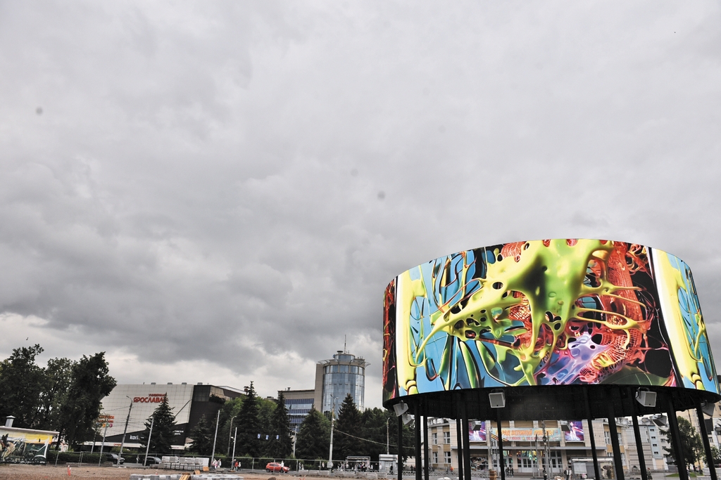 Среди всех медиаэкранов региона лучше всего отображает современное искусство кольцевой мегаэкран, установленный недавно на площади Труда. Это уникальная отдельно стоящая конструкция такого размера: ее диаметр – 15 метров, высота – 10, размеры экранов – 5,5. Ее форма может служить ярким визуальным символом Золотого кольца России, столицей которого является Ярославль. Установкой мегаэкрана занимался информационный холдинг «Верхняя Волга медиа».