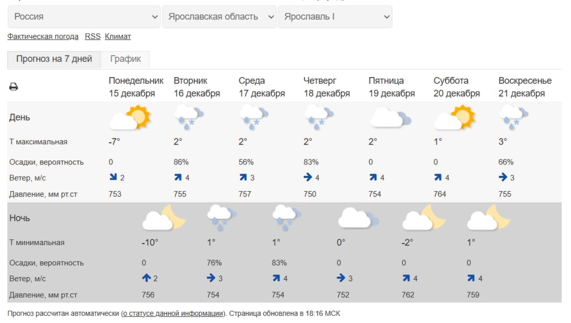 По данным Гидрометцентра, в понедельник, 15 декабря, днем ожидается до -7 градусов, ночью – до -10 градусов. Уже во вторник температура поднимется до отметок выше нуля, в том числе и ночью. На неделе прогнозируют осадки в виде дождя со снегом.