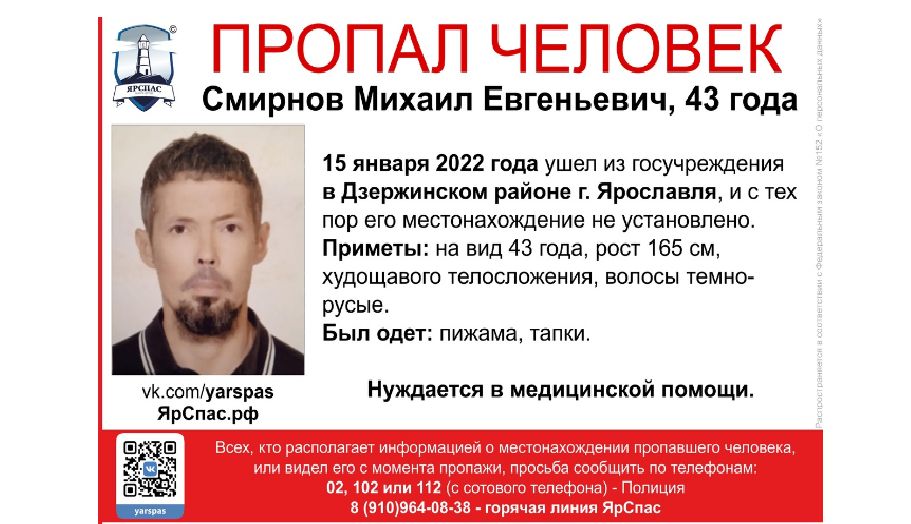 Волонтеры в Ярославской области ищут 43-летнего мужчину, который пропал 15 января. Михаил Смирной ушел с территории лечебного учеждения в Дзержинском районе. До сих пор его местонахождение не установлено. Как сообщает региональное управление СК РФ, по факту проводится проверка.