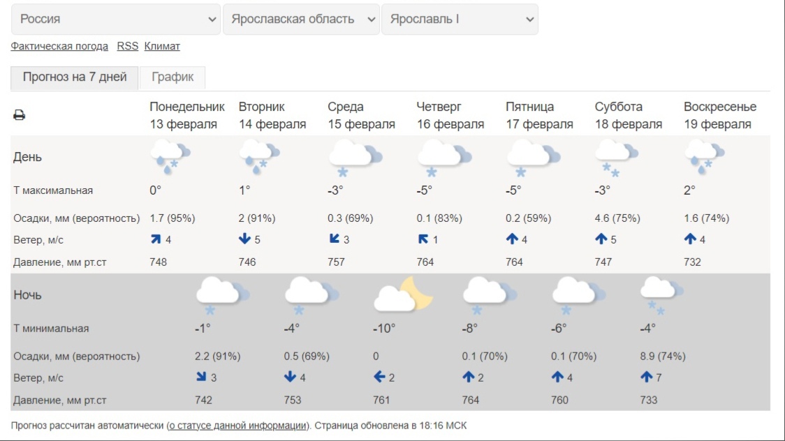 Эта неделя в Ярославской области начинается с оттепели. Однако к ее середине начнется похолодание. В ночь со среды на четверг, по данным Гидрометцентра, ожидается до -10 градусов мороза. Также эта неделя будет сопровождаться осадками. В начале и конце недели ожидается дождь со снегом, а в середине – снег.