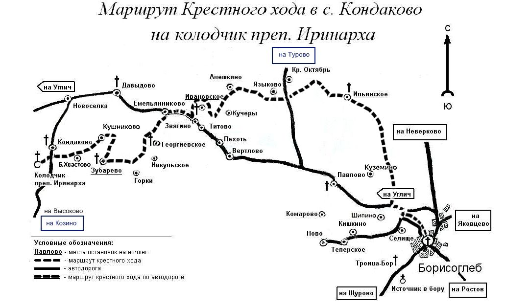 Паломничество длится четыре дня, за это время участники проходят расстояние около 60 километров. Они придерживаются тропы, по которой святой Иринарх бегал из Борисоглебского в Кондаково, будучи пастухом.