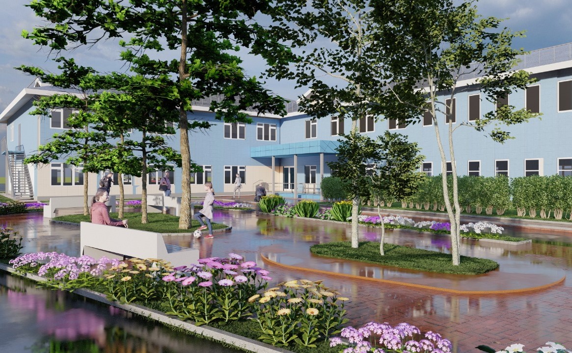 На территории обустроят удобные пешеходные зоны, проезды, тротуары и площадки, установят малые архитектурные формы, проведут озеленение. Также предусмотрено уличное освещение. По периметру участка установят ограждение.